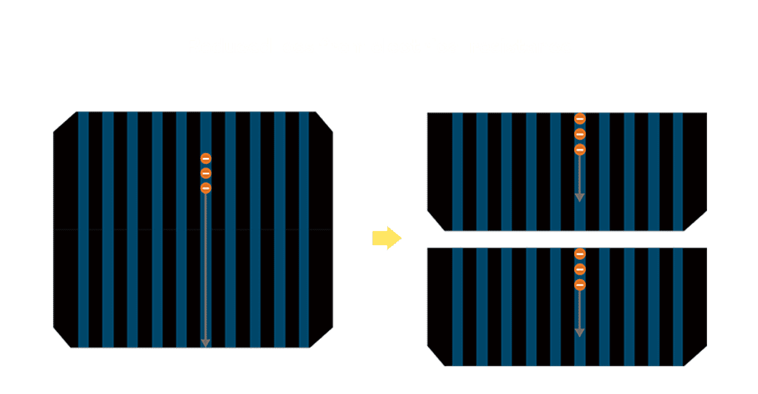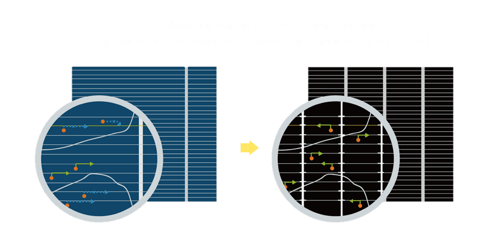 • 电池使用多条铜导线 (Copper wire) 于电池片上形成较短的电流路径,,,,提高电流收集效率,,,采用圆形设计的铜导线较传统扁平式的铜焊带 (Ribbon),,,,可增加入射至电池的光线量。。。