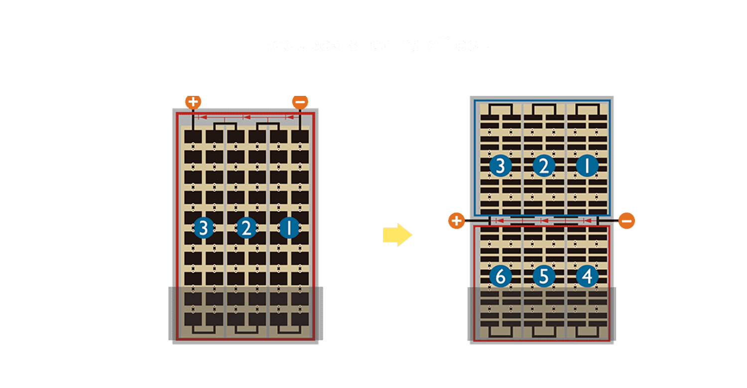 • 结合半切电池,,,,降低遮阴影响、、、提升模组抗隐裂能力、、、、并减少电阻损耗,,,进一步提升模组发电效能。。。